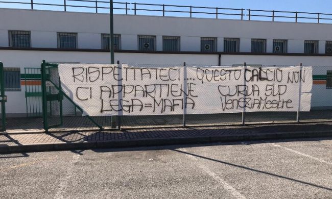 Trivenetogoal news news:  dura protesta nella notte dei tifosi del Venezia dopo la decisione di far disputare i playout da parte della Lega di Serie B a quasi un mese di distanza dalla fine della regular season. Sono stati apposti alcuni striscioni al Taliercio fra cui “Rispettateci, questo calcio non ci appartiene. Lega = Mafia. Curva Sud Veneziamestre” e “Rispetto per chi ama la maglia, non giocate!”