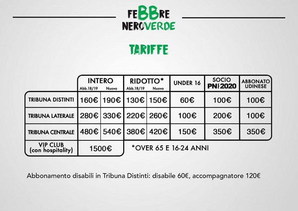 Speciali scontistiche e riduzioni per i soci PN2020 (100 euro nei Distinti, 200 in Tribuna laterale e 350 in Tribuna centrale), i vecchi abbonati (risparmio in tutti i settori), gli abbonati dell’Udinese (con la Formula Friuli), gli studenti universitari (100 euro nei Distinti) e le famiglie. In particolare, con la tariffa Family nei Distinti il pacchetto (minimo 3 abbonati, entro il terzo grado di parentela) comprenderà una tessera intera da 160 euro, una ridotta da 130 euro, la terza e seguenti da 100 euro, l’Under 16 a 30 euro; nella Tribuna Laterale comprenderà una tessera intera a 280 euro, una ridotta da 220, la terza e seguenti da 200 euro, l’Under 16 a 50 euro. Chi non avesse la PN Card, a cui è necessario associare l’abbonamento, potrà sottoscriverla al costo di 5 euro. Tutti gli abbonati del Pordenone potranno acquistare il biglietto delle gare casalinghe dell’Udinese a 10 euro nei settori Distinti e Tribuna laterale (16 gare; sono escluse quelle con Juventus, Inter e Milan). Al centro De Marchi lo sportello abbonamenti sarà attivo dal lunedì al venerdì dalle 10 alle 12.30 e dalle 17 alle 19.30; il sabato dalle 10 alle 12.30. Per informazioni scrivere a biglietteria@pordenonecalcio.com.