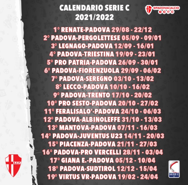 Padova, il calendario completo: via alla stagione il 29 agosto contro il Renate