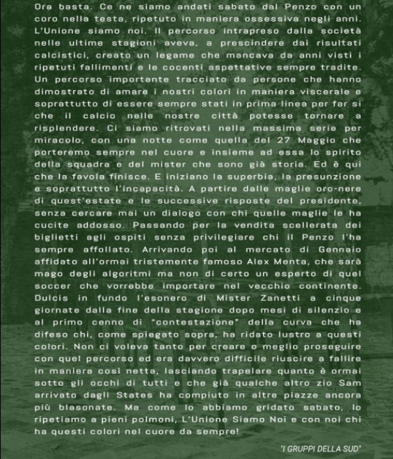 Venezia, i gruppi della Curva Sud: “La favola è finita il 27 maggio 2021: sono iniziate superbia, presunzione e incapacità”