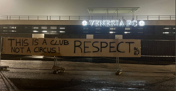 “Questo è un club, non è un circo. Ci vuole rispetto”. Con questo striscione apposto fuori dallo stadio Taliercio le Brigate Lagunari, uno dei gruppi ultras più attivi in Curva Sud, ha contestato oggi squadra e società. Il Venezia è penultimo in classifica con 9 punti, davanti solo al Perugia e domenica sarà impegnato in un’importantissima partita salvezza a Como. In panchina ci sarà Andrea Soncin, subentrato ad interim a Ivan Javorcic, in attesa della scelta di un altro allenatore