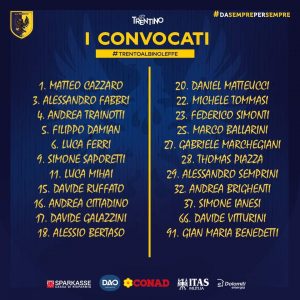 Questi i convocati di mister Tedino per la gara odierna del Trento.