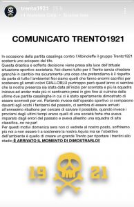 “In occasione della partita casalinga contro l’Albinoleffe, il gruppo Trento 1921 sosterrà uno sciopero del tifo.