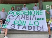 Striscione polemico nei confronti dei politici da parte di Pordenone2020 prima della partenza per l’amichevole di Tarvisio: “Pordenone cambia… con lo stadio”